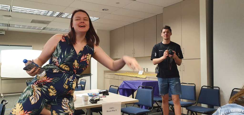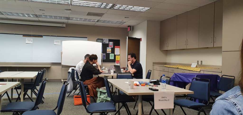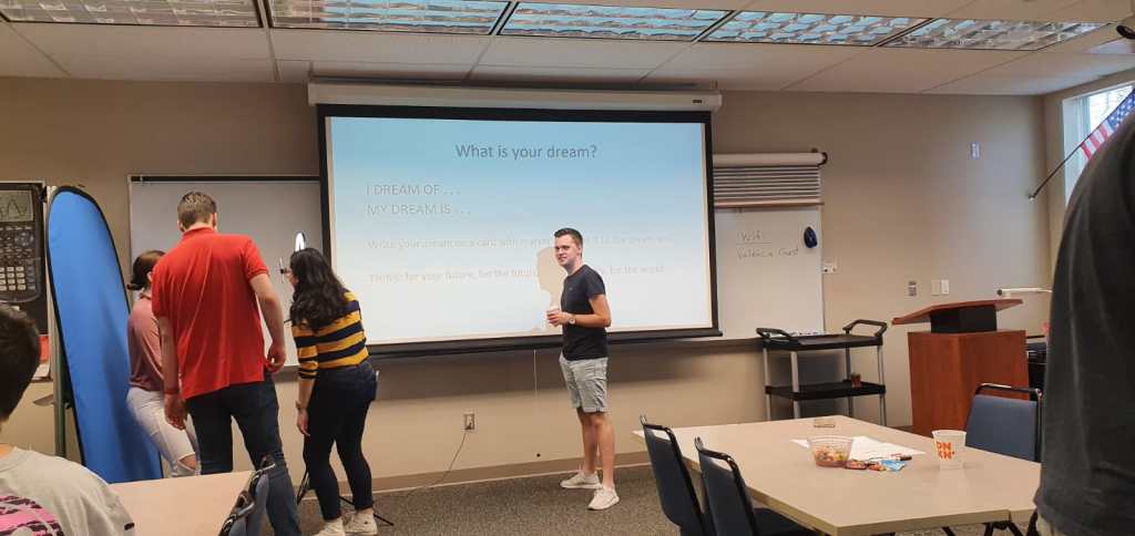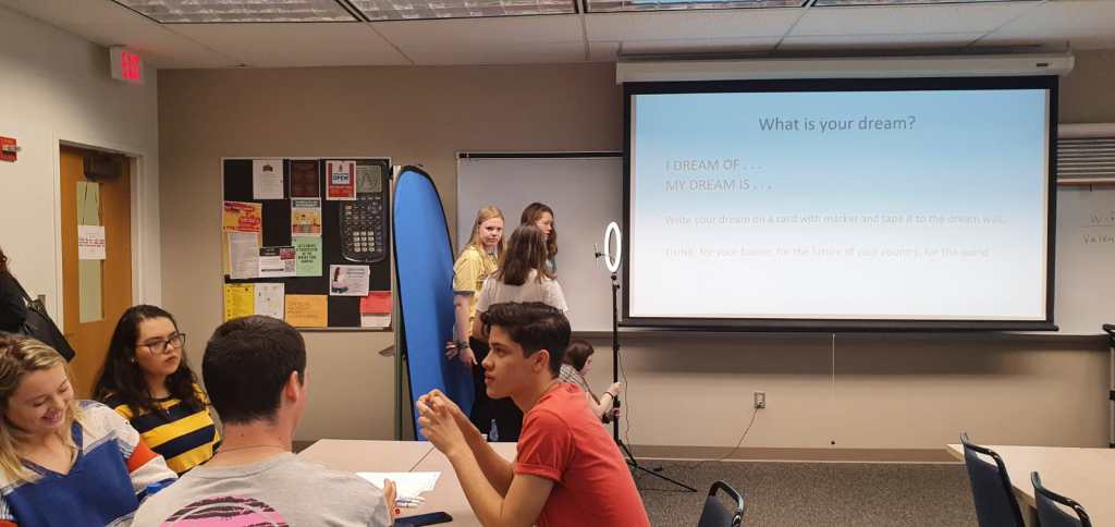 We wrote down our dream and put those on a big, red paper which was put against the wall. After that, we turned the classroom into a museum. How? Well, Valerie placed papers on the walls and tabels. There were time periods printed on them. We had to form groups again with the Valencia students. And then we had to implement the time period. So for example: my time line said “the immigrants coming to America”. So we acted as if we were on a boat, seeing the statue of liberty and saying out loud that we hoped to find a job and trying to pursue the American Dream. I felt awkward, as it was out of my confortzone, but I had a good laugh and the students were so nice and fun to hang out with. A couple of teachers and students came to look at us. It was great.